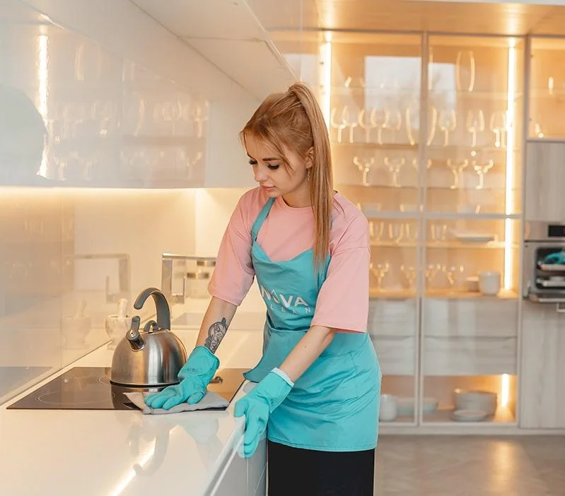 В частном доме много зон, и у каждой свои задачи. На кухне очищаем плиту, фартук, столешницы, раковину, фасады снаружи, выносим мусор. В санузлах обрабатываем сантехнику, плитку, зеркала, уделяем внимание швам и смесителям. В жилых комнатах протираем мебель, подоконники, выключатели, пылесосим ковры.